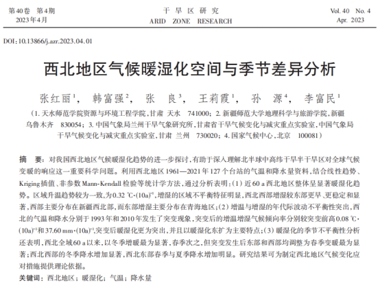 气候变化不仅影响人类生存环境,也将影响世界经济和社会进步。在全球变暖背景下,深入研究我国西北地区气候暖湿化趋势,对于理解北半球中高纬干旱半干旱区对全球气候变暖的响应这一重要科学问题具有重要意义。近期,我院副教授张红丽团队于2023年4月发表在《干旱区研究》期刊上的研究成果“西北地区气候暖湿化空间与季节差异分析”被中国气象局深度报道。