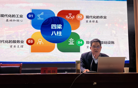 左国防从“把握现代化产业体系的深刻意蕴”“认清产业体系建设的现状与挑战”“推进现代化产业体系建设着力点”三个方面,全面阐释现代化产业体系的整体布局、重大意义、建设现状、主要举措。他要求同学们:一是要深刻认识到加快现代化产业体系建设是时代所需、发展所需,是我国构筑未来发展战略优势的重要支撑;二是要认识到进入新发展阶段,全面建设社会主义现代化国家,提高经济实力和科技实力,必须紧紧抓往产业现代化这个关键,夯实现代化产业体系这个物质技术基础,通过打造完整而有韧性的产业链供应链,把产业安全、经济安全、国家安全牢牢掌握在自己手中。