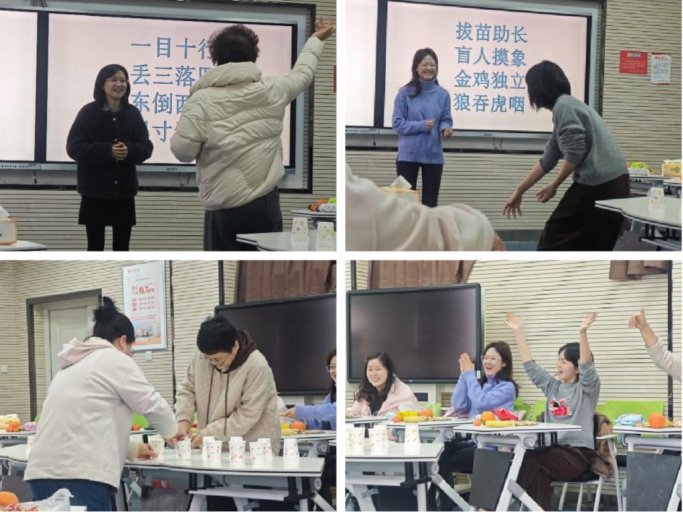 随后,精彩的趣味游戏环节正式拉开帷幕。“看数字猜颜色”环节,女教师们全神贯注,大脑飞速运转,将数字与色彩巧妙联想,紧张刺激的氛围让现场不时爆发出阵阵惊叹。“你比划我猜”中,教师间默契十足,生动的肢体语言和精准的描述,引得众人捧腹大笑,也让大家深刻体会到了团队协作的力量。“看数字猜成语”更是考验着大家的知识储备和反应能力,一个个妙趣横生的成语在欢声笑语中被猜出。